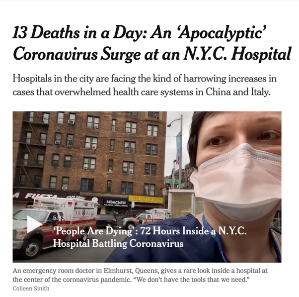 [1] Rothfeld, M., Sengupta, S., Goldstein, J., & Rosenthal, B. M. (2020, March 25, 2020). 13 Deaths in a Day: An ‘Apocalyptic’ Coronavirus Surge at an N.Y.C. Hospital. New York Times. Retrieved from https://www.nytimes.com/2020/03/25/nyregion/nyc-coronavirus-hospitals.html.