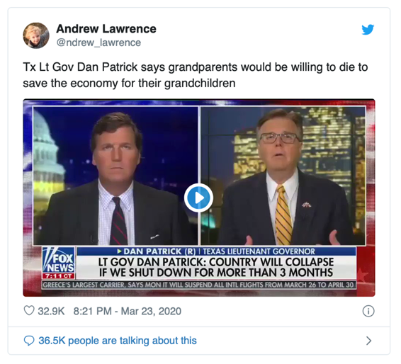 [3] Rodriguez,Adrianna. (2020, March 24). Texas' lieutenant governor suggests grandparents are willing to die for US economy. Retrieved from https://www.usatoday.com/story/news/nation/2020/03/24/covid-19-texas-official-suggests-elderly-willing-die-economy/2905990001/