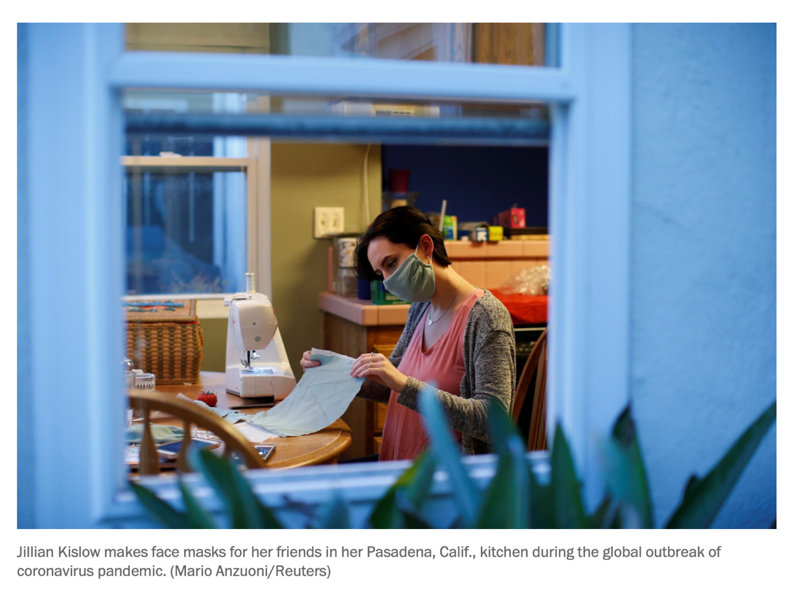 (加州帕萨迪纳的居民在厨房中缝制口罩。)