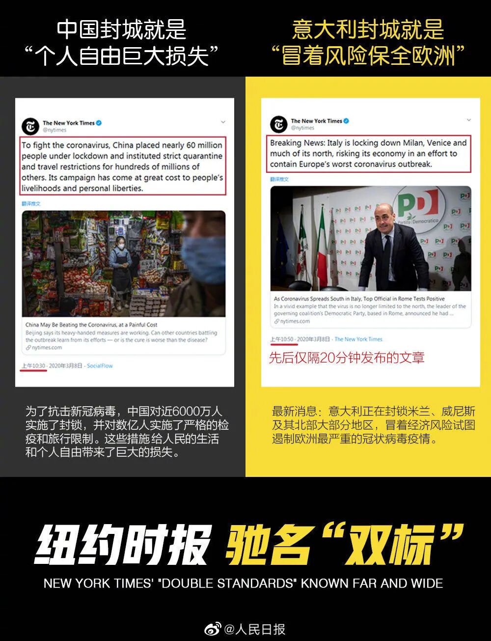 疫情期间,美国《纽约时报》《华尔街日报》、英国《泰晤士报》、法国《费加罗报》及CNN、BBC等欧美各大主流媒体对中国的防疫工作进行了惯性负面报道。其中《纽约时报》等媒体对中国抗疫努力持双重标准。比如,《纽约时报》称意大利“封城”是“冒着经济风险保欧洲”,而中国“封城”是“以牺牲人民自由为代价”。