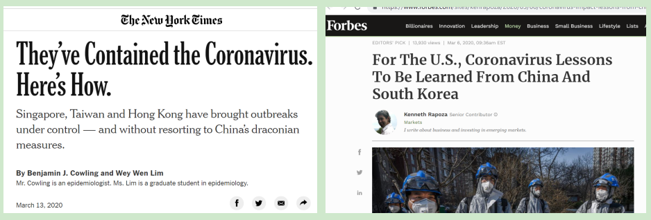 《纽约时报》:《他们已经控制了冠状病毒,经验在此》(左)福布斯网站:《美国从中国及韩国借鉴应对冠状病毒经验》(右)