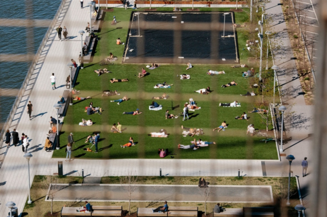 (周末纽约Domino公园中嗮太阳和野餐的民众试图保持所谓的“Social Distance”。)