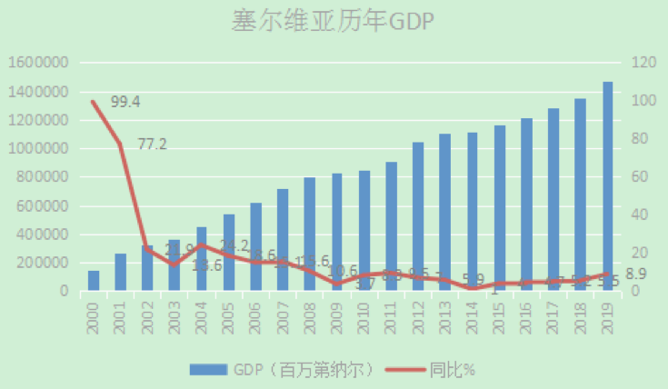 从塞尔维亚的经济说起曾经看到过这样一则故事:“二十多年前,小沃克实在饿得不行了,拿着母亲给的一千万第纳尔跑到卖面包的妇女家。‘涨价了,现在五千万第纳尔才能买得到一块面包。’‘可是昨天都还只是五百万。’”故事里的第纳尔是塞尔维亚的法定货币,故事反映了塞尔维亚国内通胀的严重程度。实际上,历史上塞尔维亚的经济曾一度低迷。塞尔维亚的经济基础其实相对不错,但由于联合国1992-1995年的经济制裁以及在战争中基础设施等的严重破坏,经济损失相当严重。塞尔维亚在南联盟时代经历了10年国际经济制裁,3年波黑战争。尤其是1999年科索沃战争中,塞尔维亚经历了为期78天的连续轰炸,对其国内经济发展和基础设施造成灾难性地毁坏。直到进入21世纪,塞尔维亚经济逐渐好转。从历年GDP增速看,塞尔维亚经济发展速度较快,因此被称为“巴尔干之虎”。2019年,塞尔维亚实际GDP是1990年的1.03倍,人均实际GDP是1990年的1.17倍,年平均人口数量是1990年的87.93%。