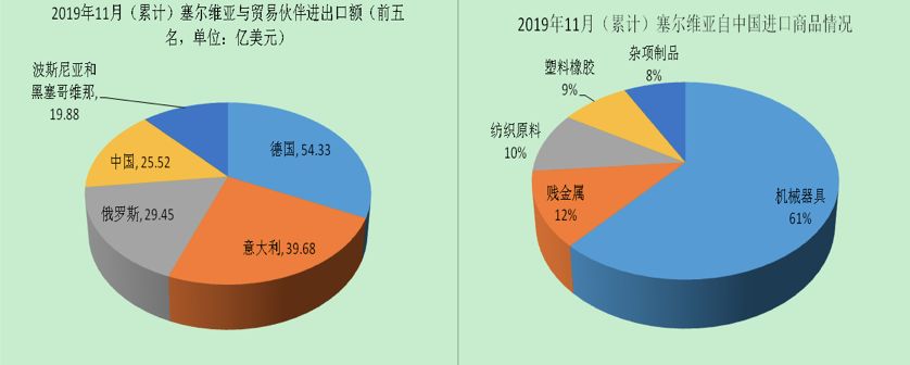 2016年河北钢铁集团收购斯梅代雷沃钢厂,并扭亏为盈,解决了大量工人的就业问题;2017年中国银行在塞设立分行;2018年跃升为塞第一大出口企业,使其成为中塞产能合作的榜样;2018年紫金矿业成功收购博尔铜矿等等。中国企业在欧洲承建的第一座桥梁、第一个电站、第一条高速公路和高速铁路均在塞尔维亚,塞是中国在中东欧地区建设基础设施项目最多的国家。近年来,中国已经成为排在塞尔维亚进出口总额前五位的贸易伙伴,是塞尔维亚最重要的贸易伙伴之一。2019年前11个月贸易总额高达25.52亿美元。中国出口到塞尔维亚的商品包括机械器具、贱金属、纺织原料塑料橡胶等等,其中机械器具最多,占比61%。