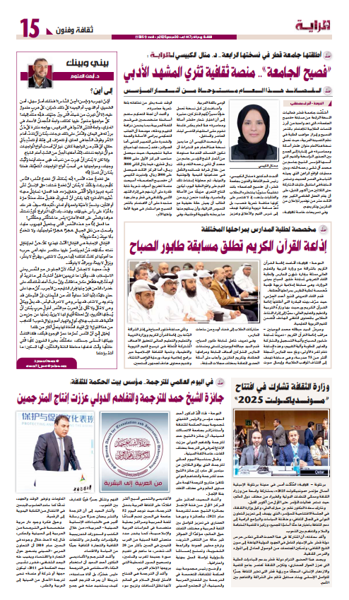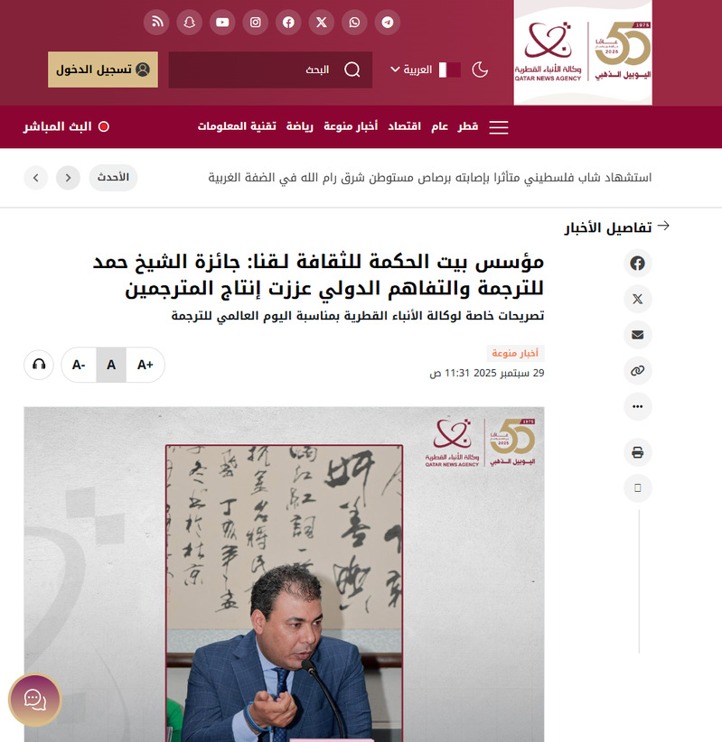 当地时间2025年9月29日,值2025年国际翻译日之际,卡塔尔《阿拉伯人日报》《旗帜报》以及卡塔尔通讯社刊登专题报道称,希克迈特文化产业集团创始人兼总裁、中国传媒大学人类命运共同体阿拉伯研究中心主任艾哈迈德·赛义德博士强调,“谢赫哈马德翻译与国际谅解奖”促进了多种语言,特别是中文翻译领域的知识产出。