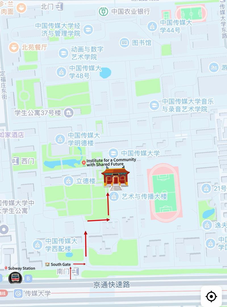 Exit via Exit B of the Communication University of China SubwayStation, then cross the footbridge and walk east to reach the South Gate of the Communication University of China.